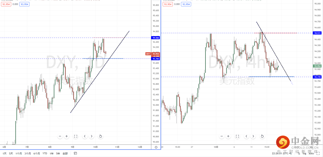 美元指数天图:目前行情继续在相对高位区间徘徊纠结,但整体趋势则保持多头方向。下方有上升趋势线的支撑作用,以及水平支撑带在93.765附近。从日内4小时级别,价格在下行测试短期支撑带93.770附近止跌。可适当关注价格测试后的表现,如果突破上行将继续尝试多头机会,上方目标位置参考94.511一带。