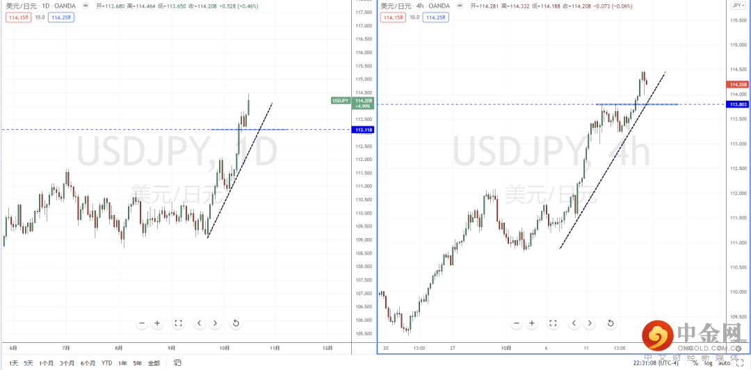 美日天图:目前整体趋势依然强势上行,下方有上升趋势线的支撑作用,其水平支撑带在113.243附近。虽然趋势格局处于在多头方向,但不宜追多。从日内4小时级别,可适当关注价格回测支撑带113.803附近测试后再次上行的多头机会,其目标位置参考周线前期高点附近。