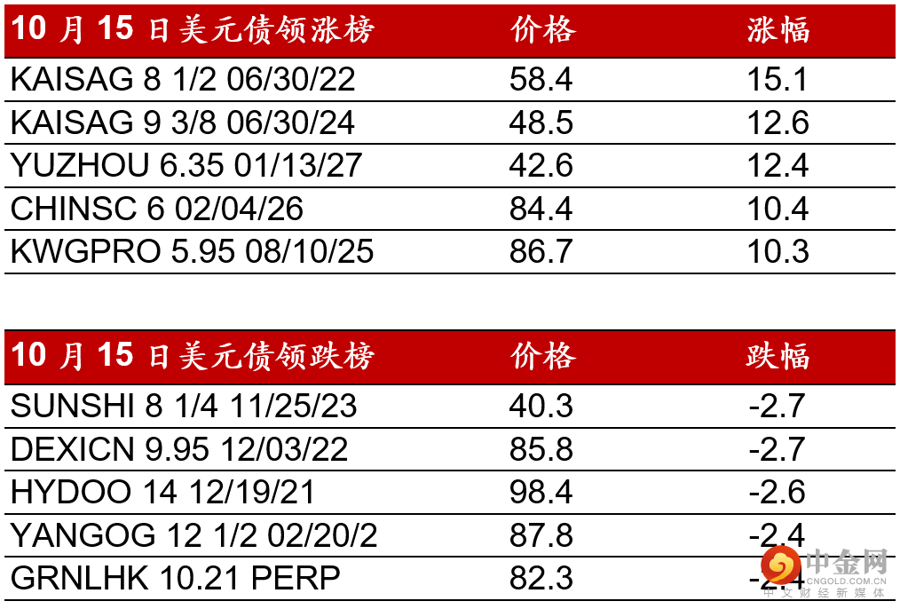 部分发行人持续回购债券,中梁公告公司在10月12日至15日回购1100万美元21年11月到期债券;奥园公告公司回购3支22年到期债券,面值为300万美元。