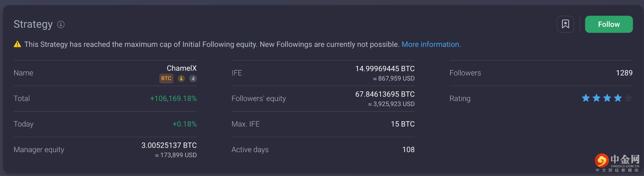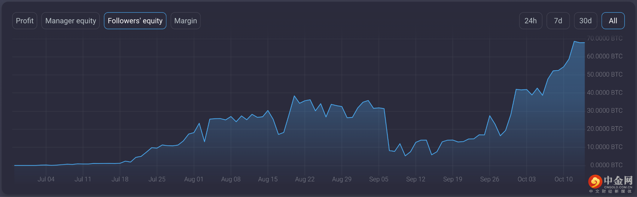 考虑到最初的追随者权益只有 14,000 BTC,目前约为 867,000 美元,而现在的追随者权益总额为 67BTC 和 390 万美元,这意味着 53BTC 的收益大约价值 3,058,000 美元! 想象一下,只要选择合适的战略经理,就可以赚那么多钱。