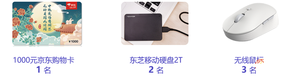 一等奖:1000元京东购物卡1个、二等奖:移动硬盘2个、三等奖:无线鼠标3个