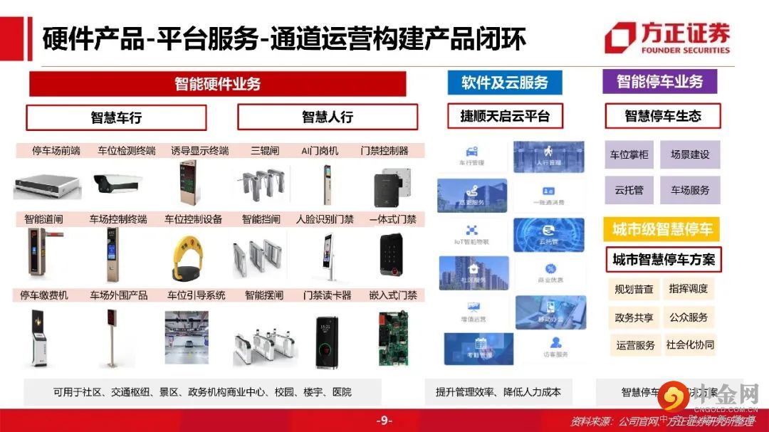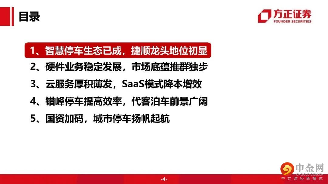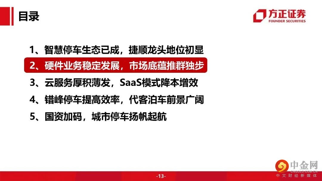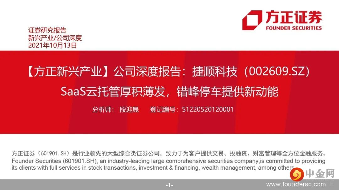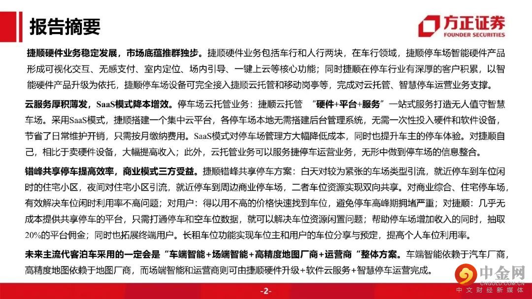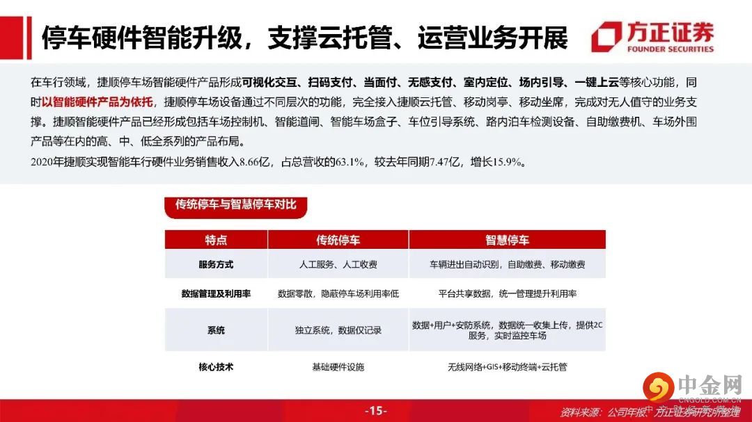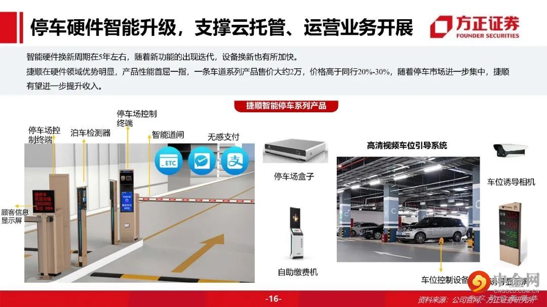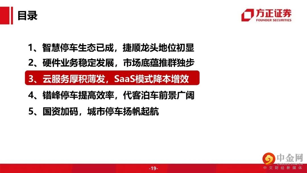 捷顺硬件业务稳定发展,市场底蕴推群独步。云服务厚积薄发,SaaS模式降本增效。停车场云托管业务:捷顺云托管 “硬件+平台+服务”一站式服务打造无人值守智慧车场。采用SaaS模式,捷顺搭建一个集中云平台,各停车场本地无需搭建后台管理系统,无需一次性投入硬件和软件设备,节省了日常维护开销,只需按月缴纳费用。SaaS模式对停车场管理方大幅降低成本,同时也提升车主的停车体验。对捷顺自己,相比于卖硬件设备,大幅提高收入。