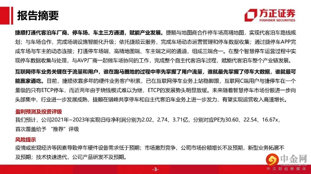 未来主流代客泊车采用的一定会是“车端智能+场端智能+高精度地图厂商+运营商”整体方案。车端智能依赖于汽车厂商,高精度地图依赖于地图厂商,而场端智能和运营商则可由捷顺硬件升级+软件云服务+智慧停车运营完成。捷顺打通代客泊车厂商、停车场、车主三方通道,赋能产业发展。盈利预测及投资评级:我们预计,公司2021年~2023年实现归母净利润分别为2.02、2.74、3.71亿,分别对应PE为30.60、22.54、16.67x,首次覆盖给予 “推荐”评级。风险提示:疫情或宏观经济等因素导致停车硬件设备需求低于预期;市场激烈竞争、公司市场份额增长不及预期,新型业务拓展不及预期;技术快速迭代,公司产品研发不及预期。
