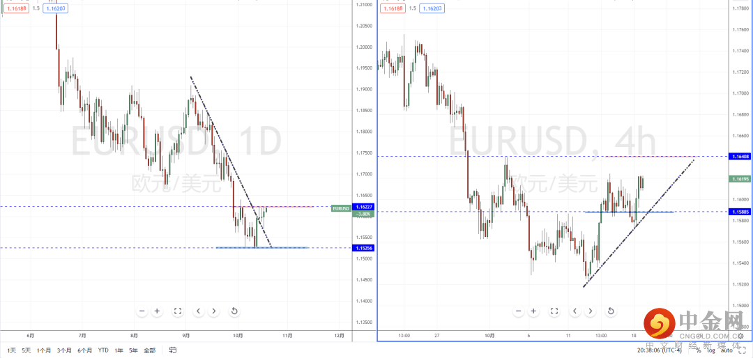 欧美天图:近期在受到美元持续走弱影响,欧美在关键位置附近回测下降趋势线支撑后再次起稳,并且冲击上方水平压制带1.16227附近。从日内4小时级别,价格也在纠结调整后起稳上行。可适当关价格继续向上的多头机会,上方区间目标位置参考1.16408一带。