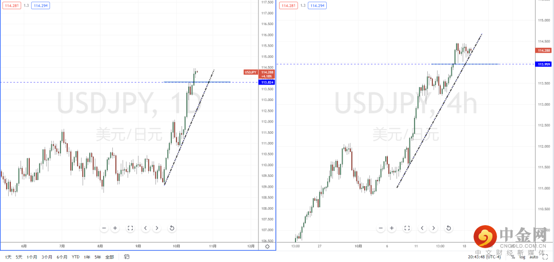 美日天图:目前趋势继续处于在多头阶段中,下方有上升趋势线的支撑作用,短期水平支撑带在113.824附近。由于行情已经连续上行幅度较大,不宜追多行情。从日内4小时级别,可适度关注价格回测支撑后再次起稳上行机会,其目标位置参考周线前期高点附近。