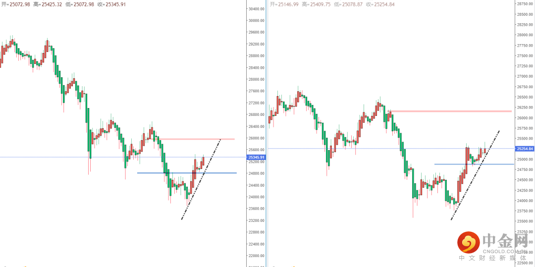 恒生指数天图:目前整体趋势继续处于在多头格局中,下方有上升趋势线的支撑作用,其水平支撑带在24919.43一带。从日内4小时级别,价格在短期支撑区域徘徊后起稳,可继续关注价格向上运行的多头机会,上方目标位置参考25897.30一带。