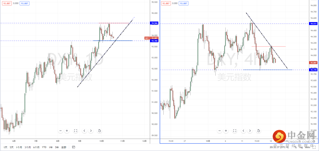 美元指数天图:目前行情继续处于在下行回测之中,虽然下方有上升趋势线的支撑,以及水平支撑带在93.765附近。但从日内4小时级别,价格在短期反弹后继续受阻。短期趋势继续偏弱,可适当关注价格在此区间附近的表现。如果破位后期趋势将可能转势为空,反之,则趋势在关键位置附近继续徘徊。