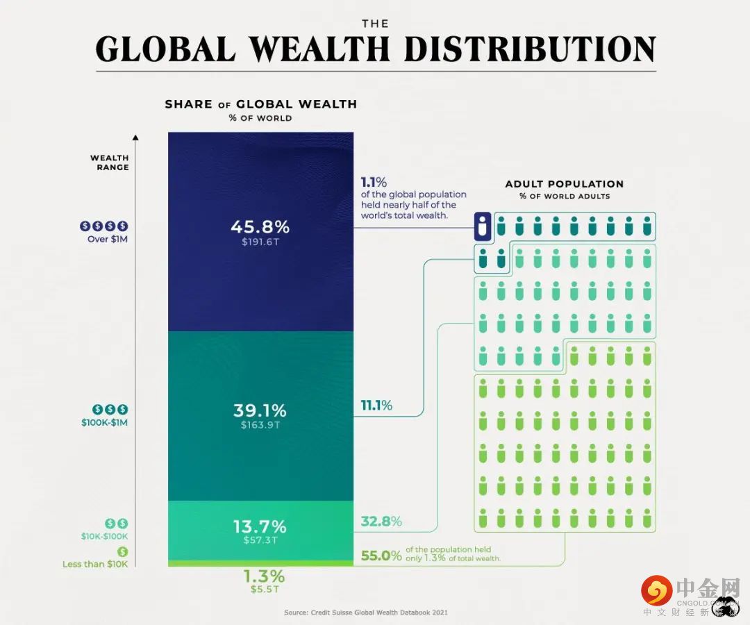 在另一端,拥有不到1万美元的55%人口只拥有全球财富的1.3%,累计约为5.5万亿美元。