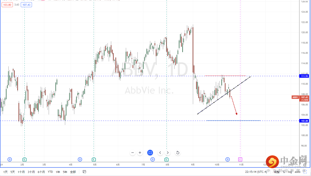 ABBV:虽然近期市场环境有所改善,但对于分化中产业则继续在弱势阶段中。从ABBV目前整体趋势在上行反弹至压制区域111.55附近再次受阻下行,并且价格也继续跌破上升趋势线的支撑作用。空头趋势将继续延续,可适当关注价格调整后的下行机会,下方区间目标位置参考102.88一带。