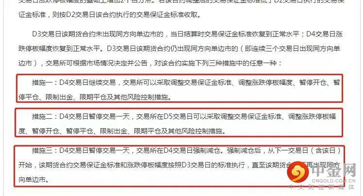 2.第四交易日暂停交易一天,交易所在第五交易日可以采取调整交易保证金标准、调整涨跌停板幅度、暂停开仓、暂停平仓、限制出金、限期平仓及其他风险控制措施。