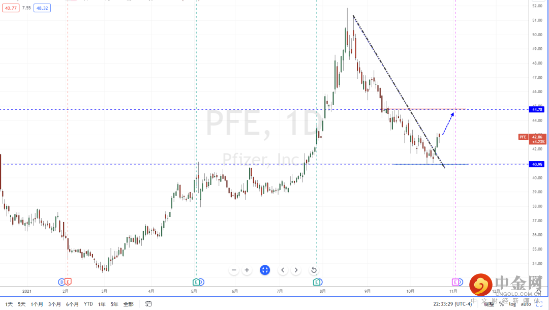 PFE:目前趋势在持续下行后止跌起稳,虽然市场环境有所放缓,但受到医疗ETF标的转势上行影响。使得PFE也有效突破下降趋势线的压制作用。现阶段趋势处于转势多头初期,短期可适当关注价格调整后再次向上的多头机会,上方目标位置参考44.78一带。