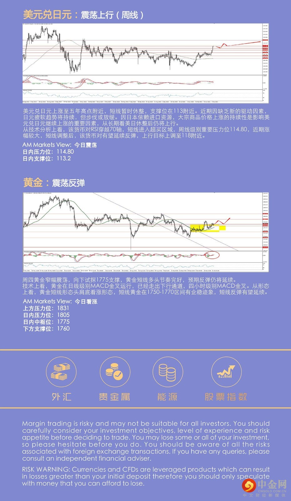 周四,美国5年期国债收益率升破1.2%,继续走高,交易员们继续提高对美联储收紧货币政策的押注,从国债收益率分析,美联储在2022年底前至少加息两次,为美元指数走强提供支撑,短线美元反弹。美联储11月份大概率率先开始锁表,货币政策开始收紧。这一预期将提振美元,但疫情时代的超级宽松,大量美元涌入市场依然需要时间消化,美元指数中期走势大概率维持宽幅震荡。 周四黄金窄幅震荡,向下试探1775支撑,黄金短线多头节奏完好,预期反弹仍将延续。原油周四剧震,最多跌超3%,创八月以来最大盘中跌幅,原油短线波动加剧,有承压迹象,预期可能由单边上行向宽幅震荡转化。