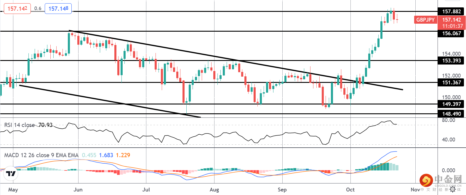 英镑兑日元上涨,价格突破 156.06 高点,大米目前在测试 157.88 阻力位。由于 MACD 和 RSI 均看涨,且零售市场持有大量空头头寸,焦点是继续推高,同时价格保持在 156.06 水平上方。