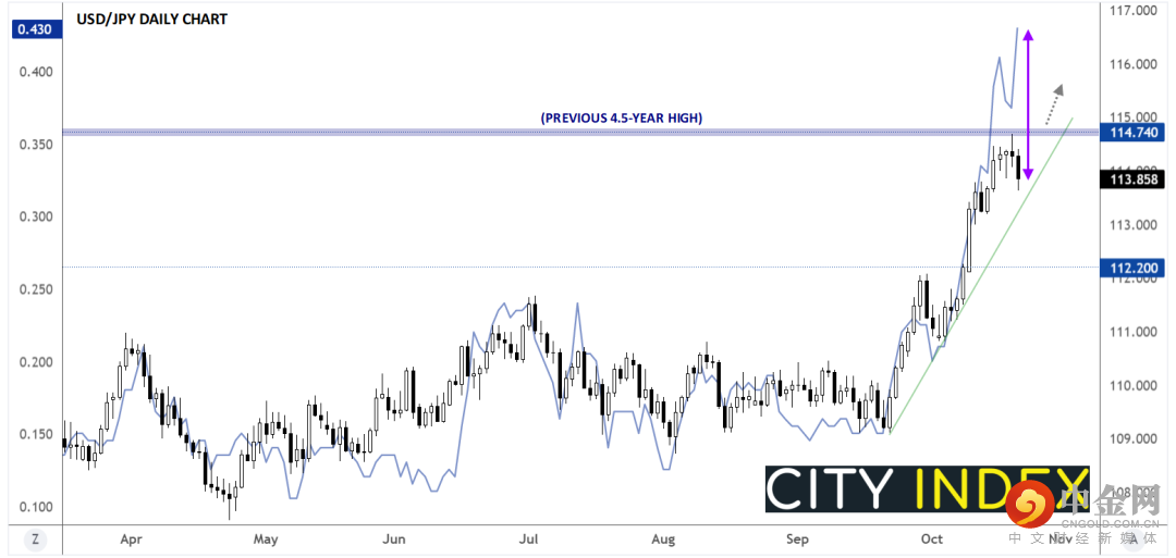 事实上,美元/日元周三测试了逾四年半最高点114.70附近,不到一个月就斩获超过550点子涨幅。114.70是备受瞩目的阻力位,多头在经历如此大幅度的反弹之后于该区域获利回吐也合情合理。但我们(至少)有四个理由,相信美元/日元可以继续反弹,攻克阻力位后创下新高: