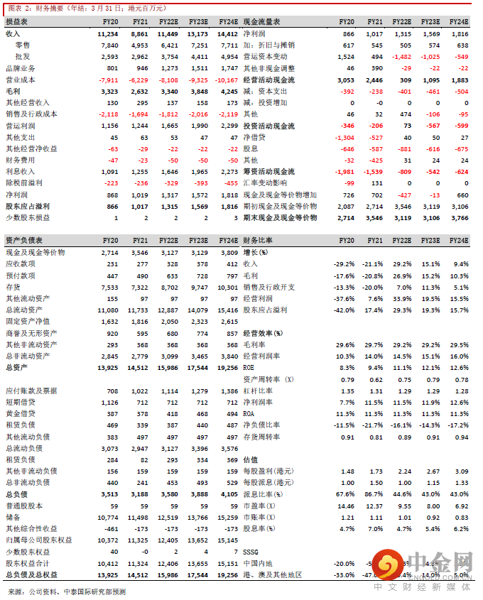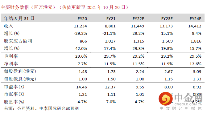 黄金产品及加盟渠道占比提升将对内地业务的毛利率构成压力,但高利润率的品牌收入伴随批发业务增加而上升,以及批发业务较自营业务拥有更高的经营利润率,我们预计公司整体经营利润率将保持稳定。基于较快的开店节奏,我们分别上调22-24财年收入预测0.8%/1.5%/1.6%至114.5/131.7/144.1亿港元;预计22-24财年股东应占溢利分别为13.2/15.7/18.2亿港元,每股盈利分别为2.24/2.67/3.09港元,目标价从32.0港元上调至32.08港元,对应23财年12倍PE。公司现价对应22及23财年PE分别仅9.6及8.0倍,均低于历史平均值,而且相对龙头周大福(1929 HK)有近57%%的估值折让,因此维持“买入”评级。