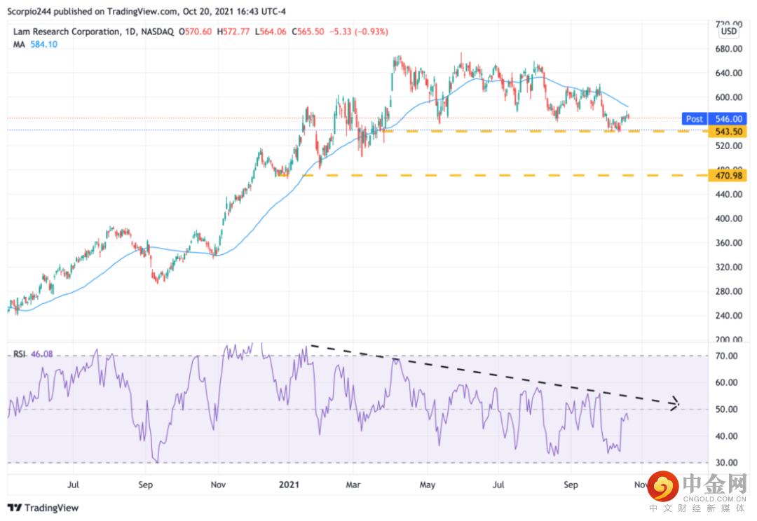 泛林集团的图表无法令人感到振奋,该公司股票需要维系住位于543美元处的支撑线。