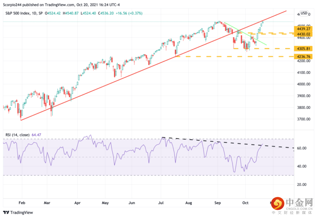 标普500指数重返2月份时的趋势线并且刚好停留在那里。标普500指数在9月17日跌至该趋势线下方并形成缺口,现在回升至该趋势线。