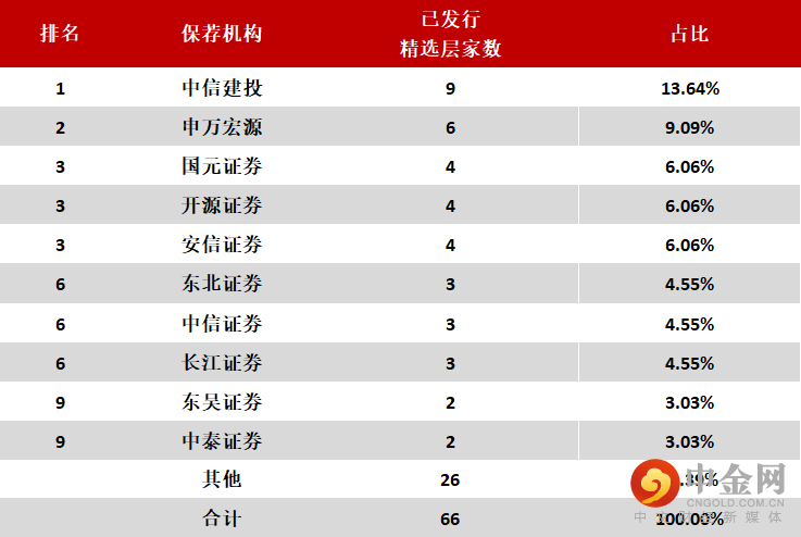 截至2021年9月5日,全国股转公司累计受理精选层项目231家。其中,已完成发行66家,已问询18家,中止审查44家,终止审查31家。中信建投累计申报12家,累计获核准9家,均位列市场第一。