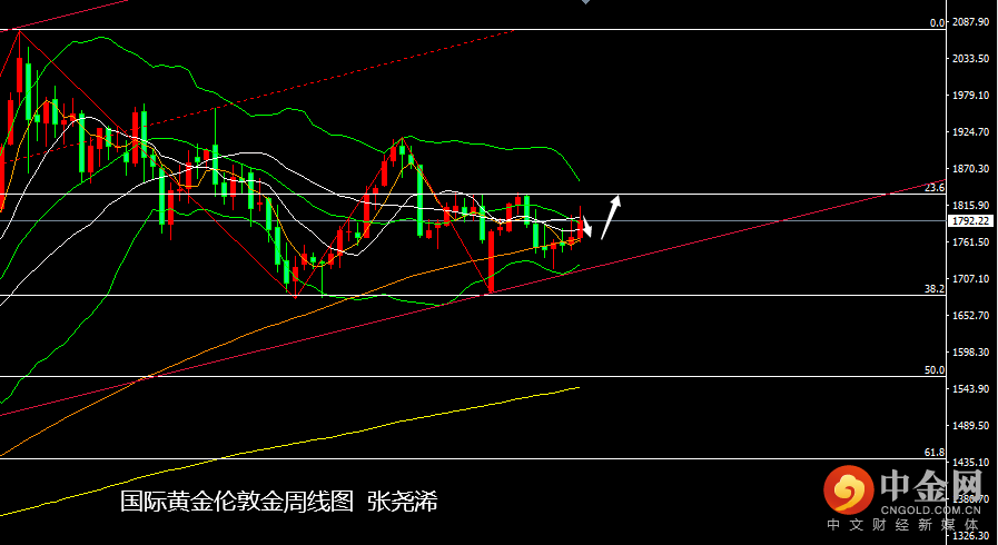黄金市场交易日(10月18日-22日)当周:国际黄金伦敦金走势积极保持反弹趋势,虽周尾收盘有所回落,但仍收取阳线。