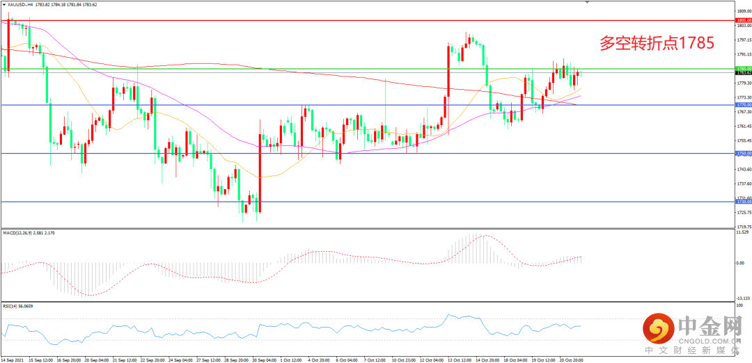 4小时图看,金价整体延续区间震荡形态,1785成为多空分水岭,均线系统粘合成为下方支撑,MACD红柱增加,RSI指标走平,日内延续震荡概率较大。