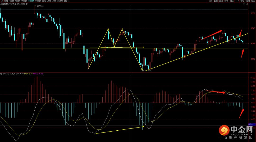 大盘跌破了三十分钟的上升趋势线,短期大概率会向下回踩3566附近的支撑,关注日线macd量柱的变化,在没有出现扩张之前,向下的回落大概率是短期的介入点。而如果出现macd量柱的扩张则大概率会延长调整时间。