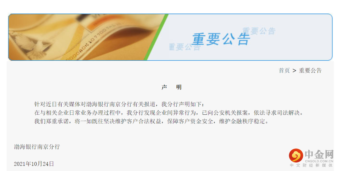 对于这么匪夷所思的事情在周末被捅了出来,渤海银行发布了声明,针对近日有关媒体对渤海银行南京分行有关报道,分行声明如下: