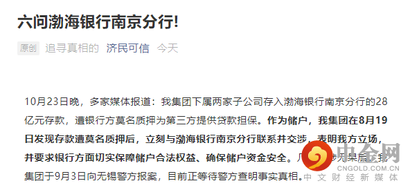 9月3日,济民可信集团在多次交涉无果后,向无锡警方报警,而今日凌晨渤海银行南京分行的声明中,表示已向公安机关报案,济民可信集团质问该分行到底是什么时候报的案?