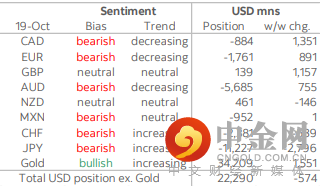 投资者再次将美元多头头寸总额小幅削减 5.74 亿美元至 223 亿美元,比 10 月初的近期高点低 10 亿美元,与截至周二的一周美元(基于彭博美元指数)下跌近 1% 一致。美元情绪的整体“小幅”调整掩盖了兑经典避险货币日元和瑞士法郎的广泛走势,这可能是因为它们对美国长期收益率攀升的高度敏感反应,而账户青睐加元、欧元、英镑和澳元。