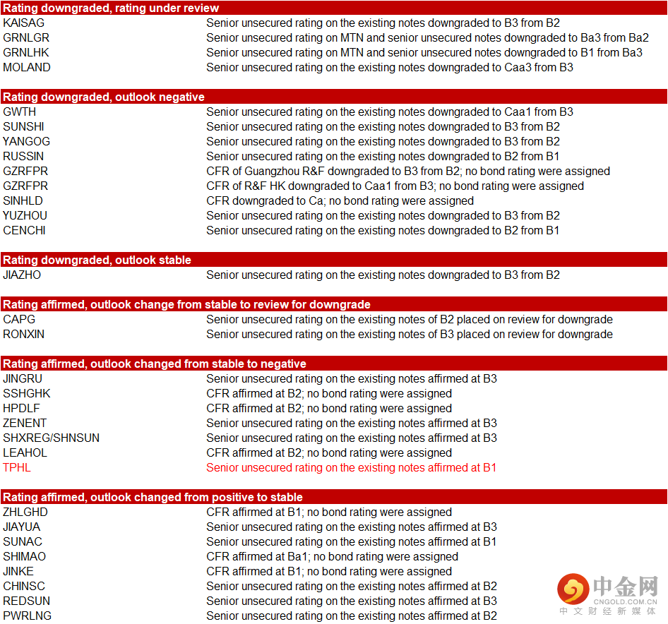 穆迪持续房地产板块重审,调降时代地产展望至负面,近期穆迪评级调整汇整请见下表。