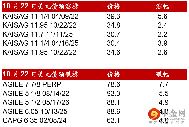 上周五(10月22日),中国高收益债券市场涨跌不一。有报道指出恒大在宽限期截止前支付了早前逾期的票息,部分债券早盘表现较好,恒大上涨约1-2pts,佳兆业反弹约1-5pts,融创也上涨约1-2pts。而受公司表外私募债传闻影响,雅居乐低开约5-6pts,但随着较多空头回补,债券价格于午前反弹至仅下跌1-2pts。公司于下午召开投资者会议试图澄清,但债券仍再次遭到抛售,较周四收跌约4-7pts。其他债券表现也受影响,奥园/时代/中骏/建业等下跌约1-2pts,而较好评级债券如碧桂园/世茂/宝龙/旭辉则相较稳定,上涨约0.5-1pt。