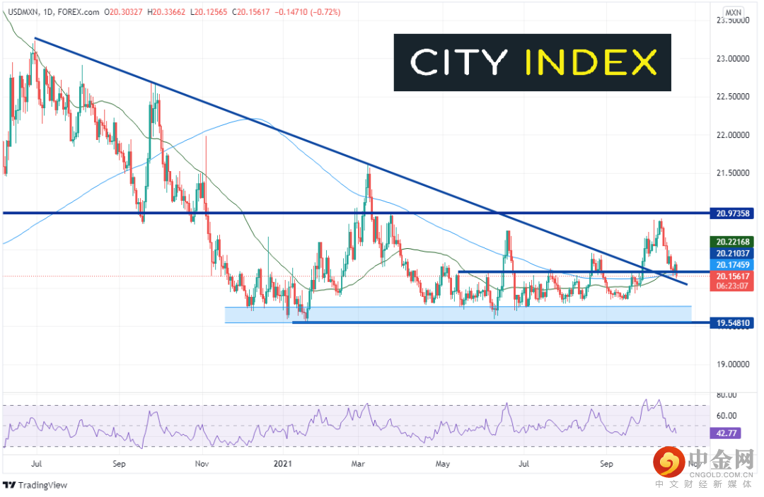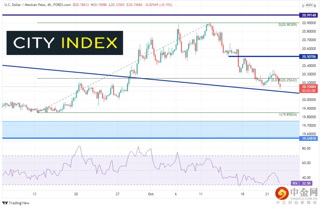 自2020年12月以来,美元/墨西哥比索一直守在19.5481和19.7464之间关键支撑区上方。每次汇价到达这一区域就会展开反弹,然后构筑高点降低。9月28日,美元/墨西哥比索终于升穿2020年6月30日以来下行趋势线。货币对交投于水平支撑位(现阻力位)略下方,目前落在20.2217和20.1000之间一个大型交汇区域,其中包括: