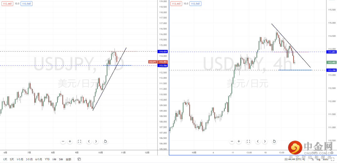 美日天图:目前整体趋势依然强势上行,下方有上升趋势线的支撑作用,其水平支撑带在113.243附近。虽然趋势格局处于在多头方向,但不宜追多。从日内4小时级别,可适当关注价格回测支撑带113.803附近测试后再次上行的多头机会,其目标位置参考周线前期高点附近。