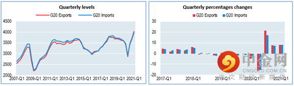 延续了始于2020年第三季度的复苏势头,以季节性调整后的当前美元计算,G20的国际商品贸易在2021年第一季度创历史新高。与前一季度相比,出口和进口分别增长了8.0%和8.1%。除英国外,所有 G20 经济体在 2021年第一季度均录得正增长,美元贬值和大宗商品价格的相关上涨在从 COVID-19 低点复苏中发挥了作用。
