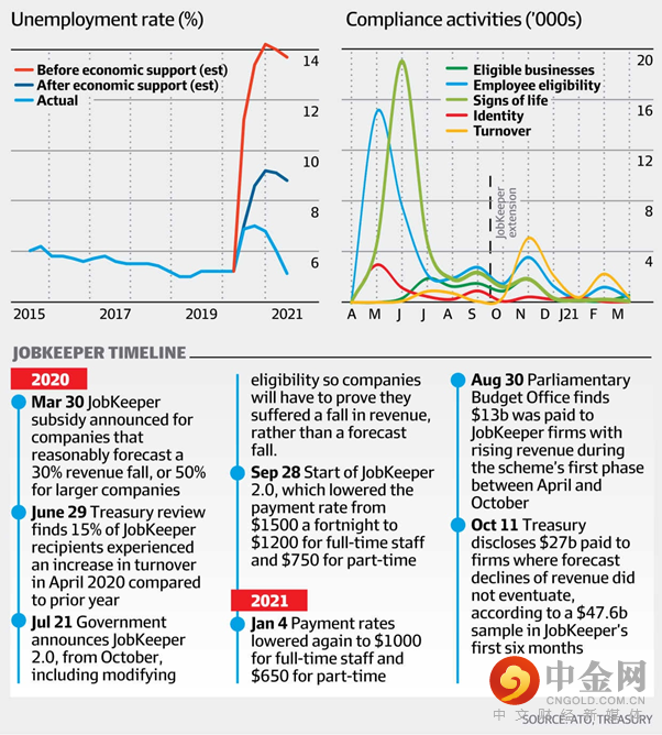 在疫情期间施行的JobKeeper政策帮助支撑了国民经济,国民经济在 2020 年 3 月持续创下有记录以来最大的月度商业信心跌幅,并将失业率峰值“至少”降低了 5 个百分点。JobKeeper 不仅影响收到付款的个别公司的生存能力,而且影响更广泛的经济复苏,这反过来又会进一步影响JobKeeper领取者。