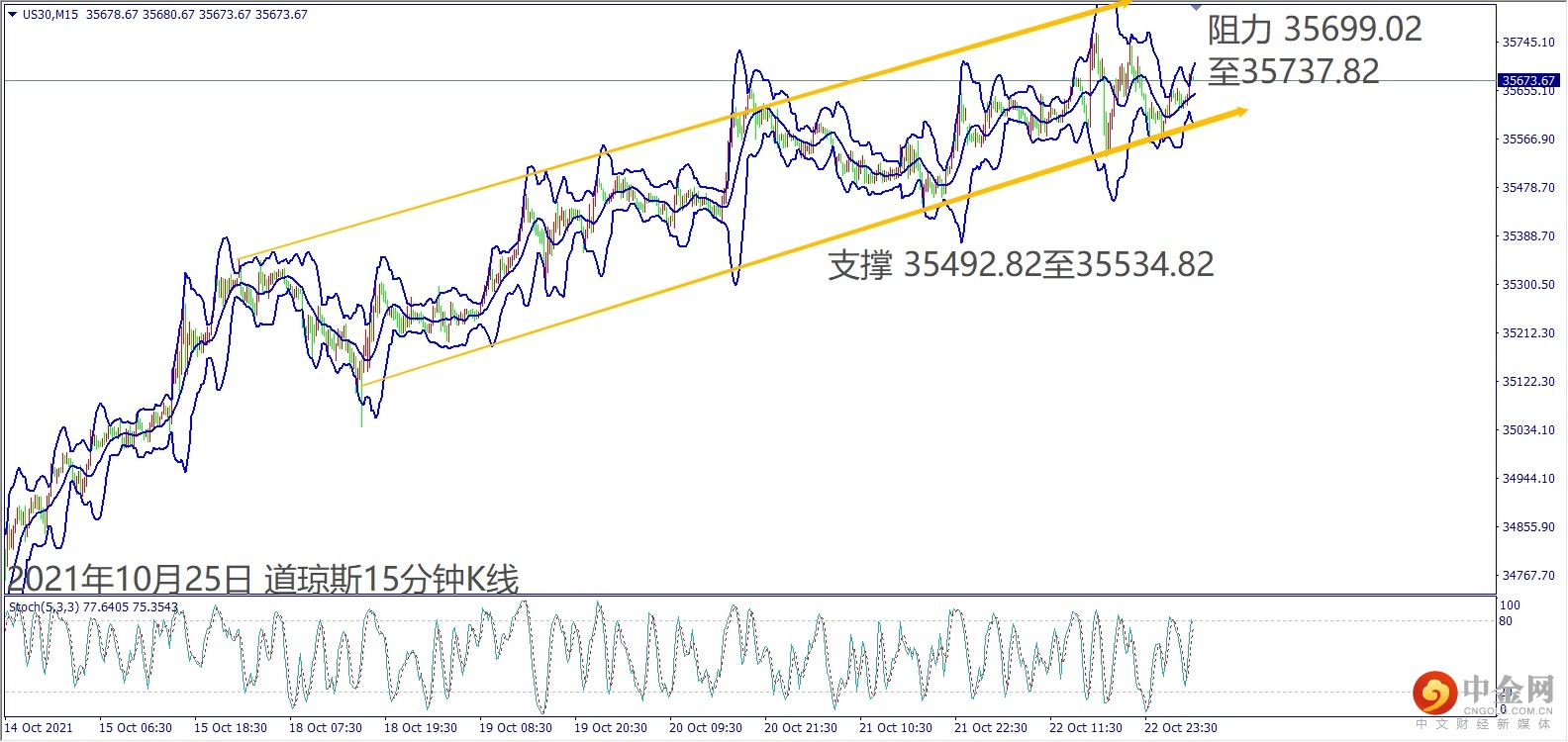 上周五(22日)美国公布制造业趋缓,代表新冠疫情已经影响美国经济复苏,但是在美国国会对于基建法案可能在近期通过,仍支撑美国道琼斯和纳指维持高档震荡。道琼斯创新高后皆出现卖盘,5日均线35,581若跌破,建议可短空操作。纳指高档震荡若冲不过5日均线15,373,建议可偏空操作。