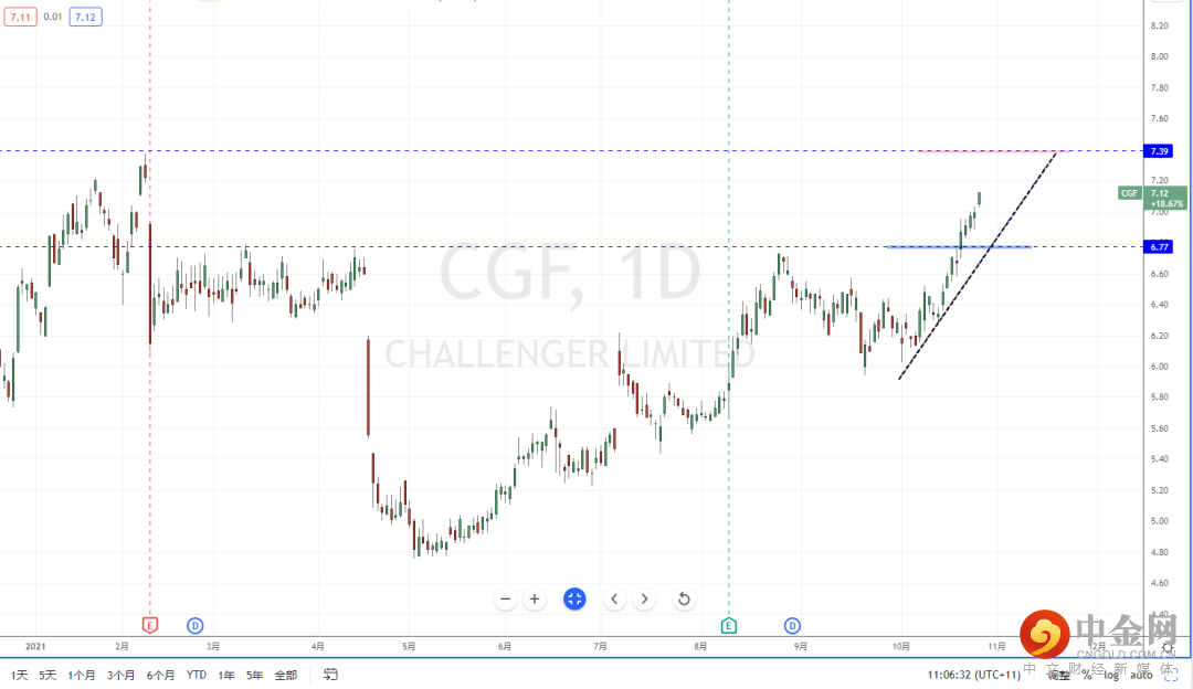 CGF:目前市场整体继续保持相对较好的乐观情绪,虽然部分ETF产业缺乏动能,但整体市场表现依然向上。从CGF目前趋势的表现,价格在关键压制区域突破后继续上行,并且也有效打开上方的多头空间。下方有上升趋势线的支撑作用,其水平支撑带在6.77附近。可适当关注价格调整后继续上行的多头机会,上方目标位置参考7.39附近。