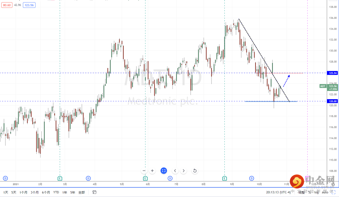 MDT:目前行情在持续向下运行后止跌起稳,虽然上方有下降趋势线的压制作用。但在近期市场趋于偏多阶段,使得部分ETF产业也有明显的持续上行迹象。因此,MDT短期也正处于测试下降趋势线一带,可适当关注价格调整后转势向上的多头机会,上方目标位置参考125.94一带。