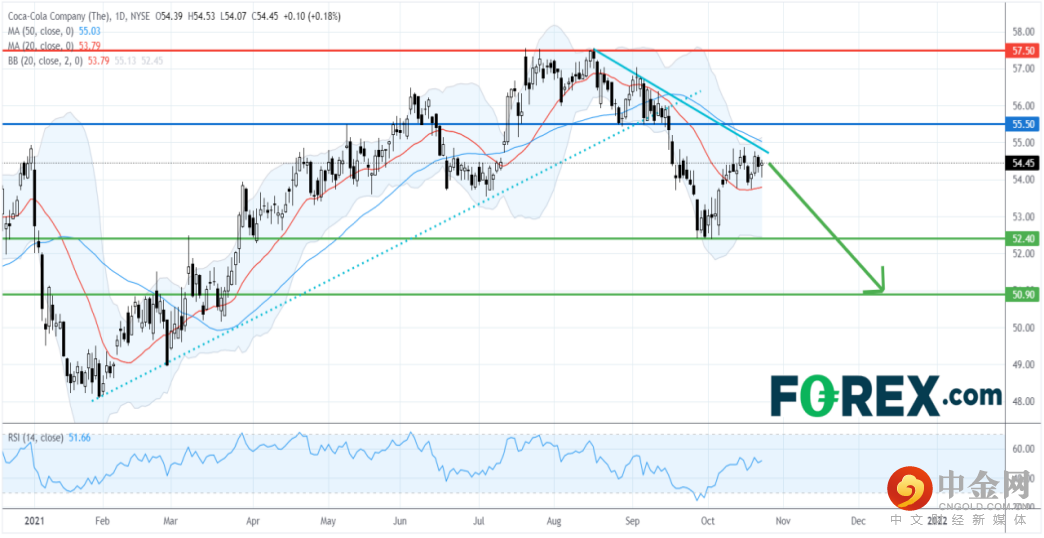 从技术角度看,如日线图所示,可口可乐股价尚未摆脱向下调整的趋势。此前,它跌破了1月以来的上升趋势线,目前受8月以来的下降趋势线压制。