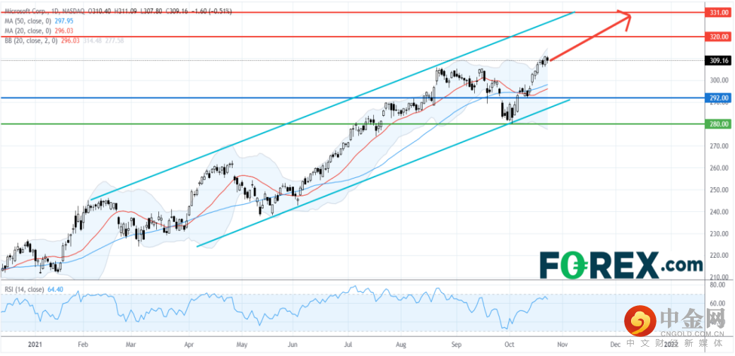 从技术角度看,如日线图所示,微软股价走势坚挺。实际上,它触及2月以来的上升通道底部后反弹,目前已回到20日及50日移动均线上方。