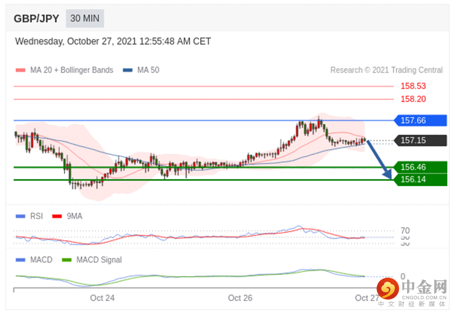 当 157.66 维持阻力位时,看跌,目标锁定在 156.14 。