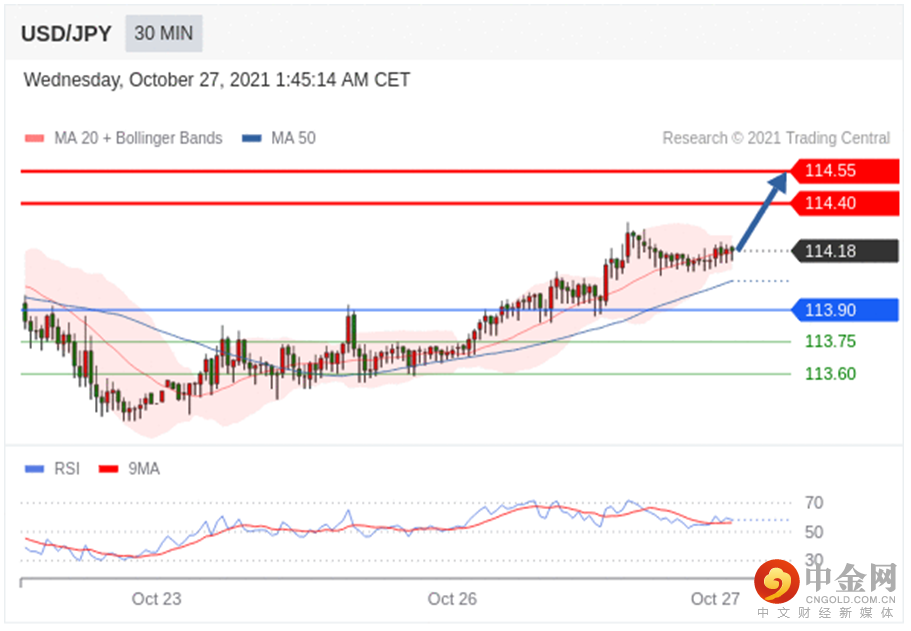 在 113.90 之上,看涨,目标价位为 114.40 ,然后为 114.55 。