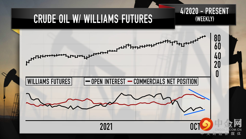 Williams认为,当未平仓合约上升,但商业套期保值者减少持仓量时,这表明油价已接近峰值。这意味着更多的合约被持有,但新的买家可能是投机者,而不是参与该行业的参与者。