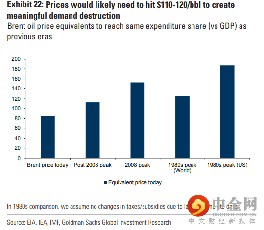 高盛指出,布伦特原油价格需要升至近150-200美元/桶,需求破坏才会最终使石油市场恢复平衡,这与2008年和1980年出现的情况类似。