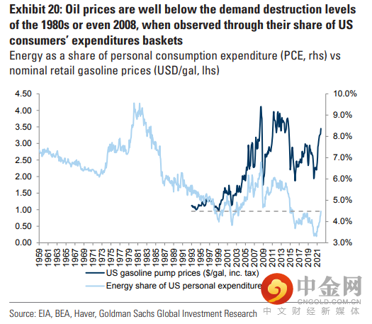 作为个人消费支出的一部分,美国消费者目前在汽油上的支出与1999年的水平相当,当时布伦特原油均价为18美元/桶。