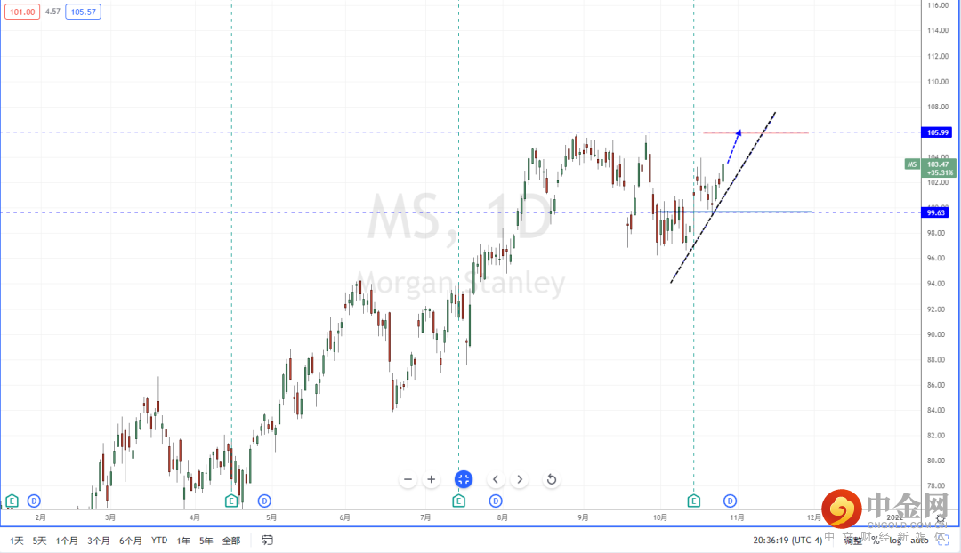 MS:由于近期市场继续处于上行态势,整体金融ETF产业也趋于偏多。从MS整体趋势表现价格在短期回测支撑带99.63附近起稳,同时下方又有上升趋势线的支撑作用。短期可适当关注价格调整后继续上行的多头机会,上方目标位置参考105.99附近。