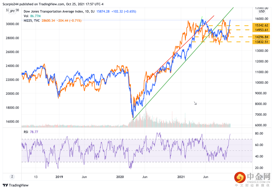 我推测道琼斯运输指数的上涨似乎是市场押注通货膨胀下运输价格的上涨。我真的找不到一个很好的理由来解释道琼斯运输指数的上涨。其上涨看起来与美国经济的复苏并无关联。有趣的是,在波罗的海干散货指数和日经指数下跌的情况下,道琼斯运输指数仍上涨。