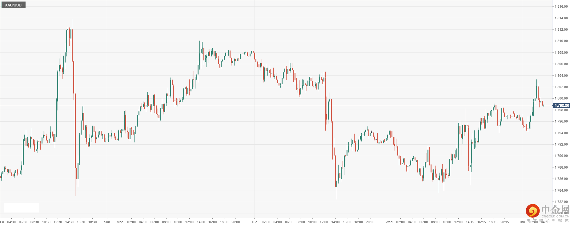 黄金兑美元周三收盘再度高涨近千八关口,今日开盘盘整在1798.80附近,因美元和美股下跌,提振金价上涨支撑。