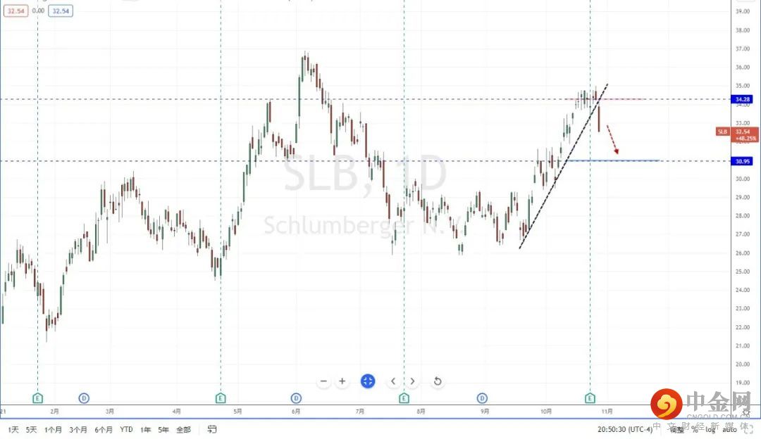 SLB:目前趋势因受到近期市场转势下行的影响,价格在关键位置附近大幅走弱,并且ETF能源类产业下行幅度较大。因此,目前SLB趋于偏空,上方水平压制带在34.2附近,短期可适当关注价格调整后下行的空头机会,下方区间目标位置参考30.95附近。