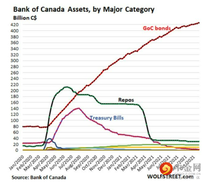 一年前,加拿大央行结束购买MBS,减少购买GoC债券。今年春天,加拿大央行减持加拿大短期国债。目前,加拿大央行的总资产为5020亿加元,较3月份的峰值下降了13%。