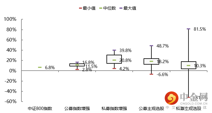 指数增强基金通常指通过量化模型选取一揽子股票,在跟踪指数(beta)的同时,力求获得超越指数表现(alpha)的股票型基金产品。“牛市有超额,熊市有安全垫”是其最为突出的特征,在熊市中,只要超额收益能覆盖指数下跌幅度,指数增强产品基本上不会产生亏损。由于需要跟踪指数,指增产品会受到跟踪误差的限制,其偏离指数幅度整体上小于主观选股型基金。如图1所示,我们观察到,无论是公募指增还是私募指增,其年化收益分化程度远小于主观多头,且90%以上的指增基金都创造了正超额收益,私募指增平均超额在10%以上。